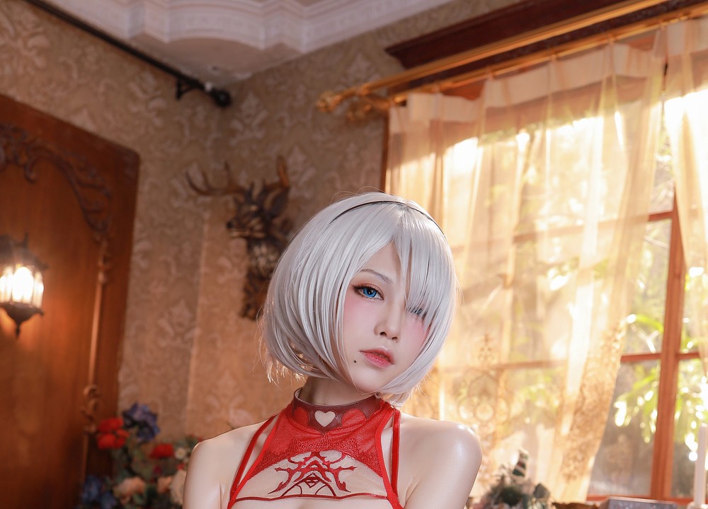 水淼aqua的这组写真巧妙地将圣诞节的欢快氛围与2B角色的冷酷气质相结合。连体装的设计既保留了2B标志性的黑白配色,又融入了圣诞元素,如雪花图案和红色点缀。丝带装的加入更是增添了一丝节日的喜庆感,同时又不失优雅。这种独特的搭配不仅展现了水淼aqua对角色的深刻理解,更体现了她在cosplay艺术上的创新精神。